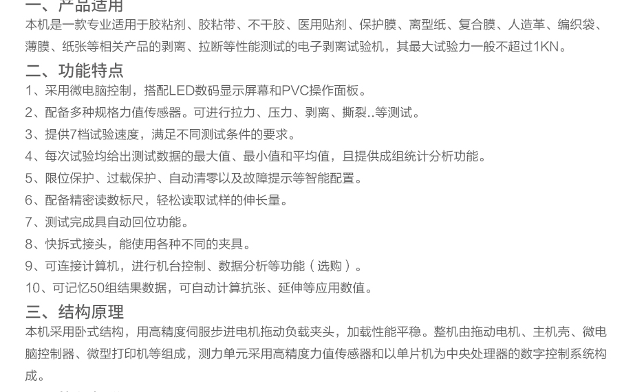 產品型號:JQ-200S 品牌:劍 喬 用途:本機是一款專業適用于膠粘劑、膠粘帶、不干膠、醫用貼劑、保護膜、離型紙、復合膜、人造革、編織袋、薄膜、紙張等相關產品的剝離、拉斷等性能測試的電子剝離試驗機,其最大試